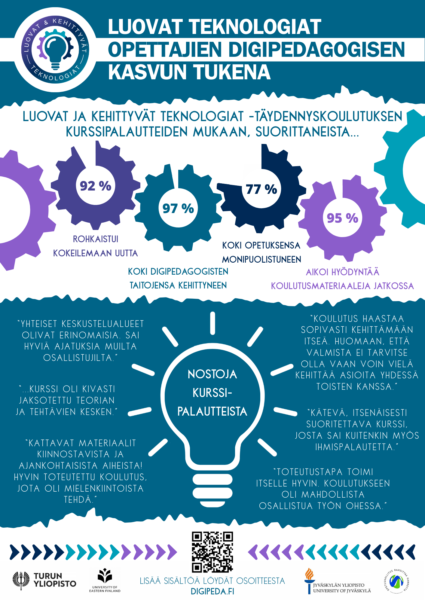 Kyselyn tavoitteena on kartoittaa opettajien digipedagogista osaamista sekä tunnistaa ne alueet, joilla tarvitaan lisää tukea, koulutusta tai resursseja. Kyselyn tuloksista laaditaan yhteenveto digipeda.fi-sivustolle tukemaan kehittämistyötä. Kyselyyn vastaaminen vie vain pari minuuttia. Kaikki vastaukset käsitellään anonyymisti ja luottamuksellisesti. Kiitos osallistumisestasi!